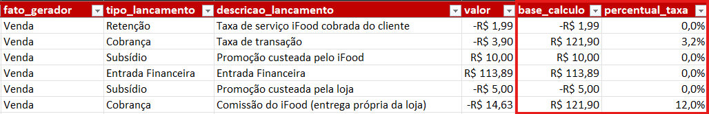 O campo ‘base_calculo’ informa qual foi o valor base utilizado para o cálculo das taxas e comissão iFood, enquanto o campo ‘percentual_taxa’ informa qual foi a taxa (de acordo com o percentual de taxas acordadas em contrato) aplicada em cima do valor base.