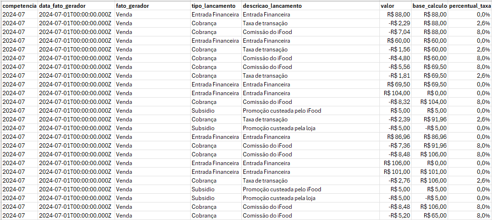 - Ao fim de todos os incrementos diários, o relatório de Julho possuirá todos os lançamentos financeiros que foram realizados no período de 01/07/2024 à 31/07/2024 pelo iFood.
