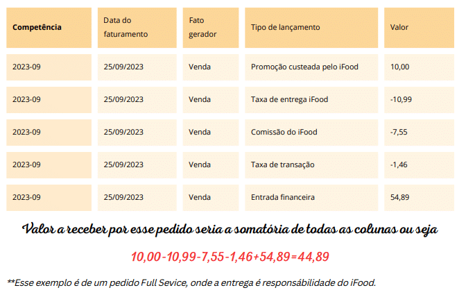 Exemplo: Temos um pedido full service que ocorreu dia 25/09/2023 e a competência dele é 09/2023, portanto ele estaria contido em um repasse realizado no mês de outubro/2023, caso a sua loja tenha contratado o plano de recebimento em 04 semanas.