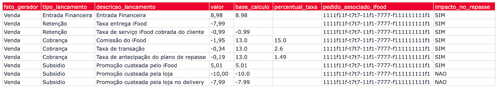 O campo ‘base_calculo’ informa qual foi o valor base utilizado para o cálculo das taxas e comissão iFood, enquanto o campo ‘percentual_taxa’ informa qual foi a taxa (de acordo com o percentual de taxas acordadas em contrato) aplicada em cima do valor base.