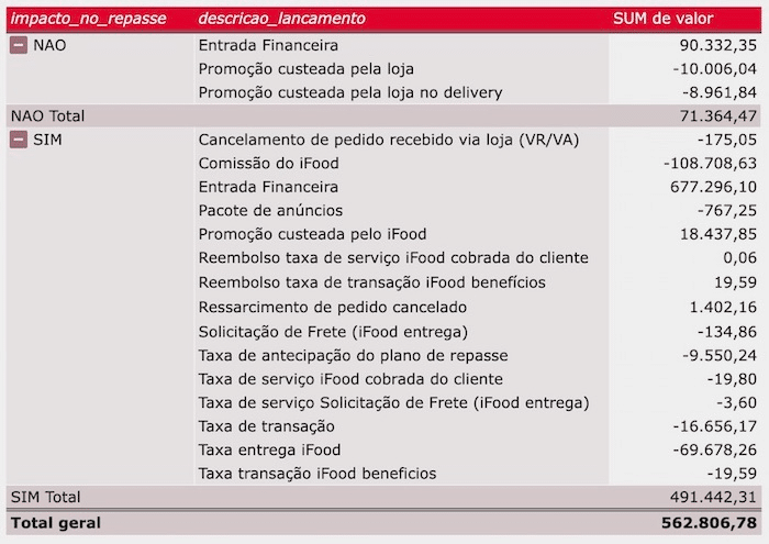 Nos relatórios de conciliação financeira do iFood os lançamentos são classificados em dois grupos: com e sem impacto no repasse. O valor líquido a ser repassado à loja é calculado considerando apenas os lançamentos com impacto.