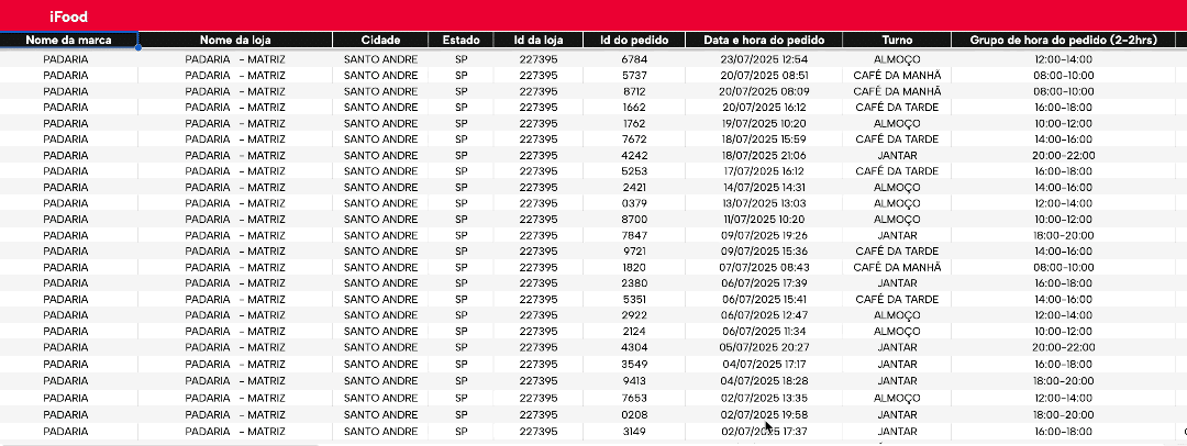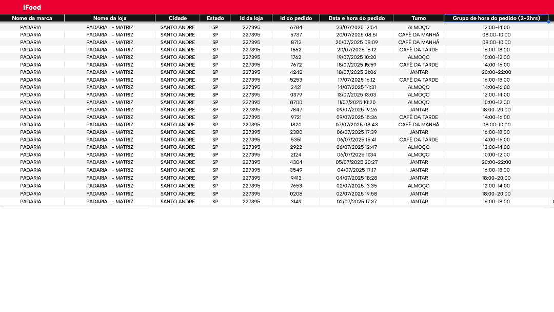 Turno | Período (Café da manhã, Almoço, Café da tarde, Jantar e Madrugada) que o pedido foi realizado pelo cliente. |