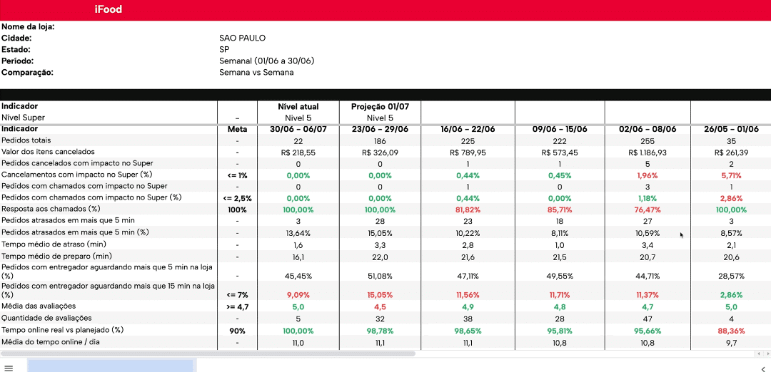 - Sinalização visual de performance com cores indicando se a loja está em linha ou fora dos padrões esperado;